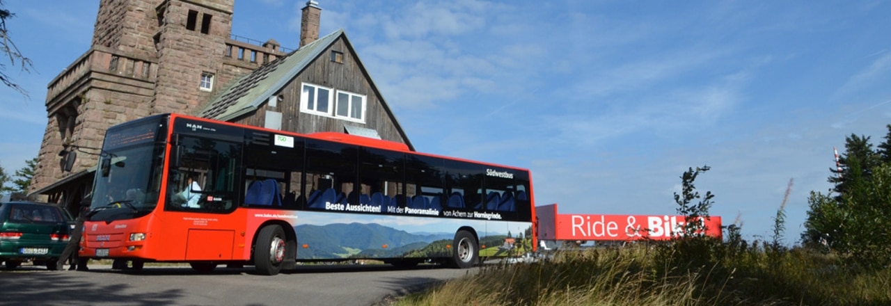 Unsere Panoramalinie 423 startet am Bahnhof Achern. Auf dem Weg zur Hornisgrinde (1164m) überwinden wir über 1000 Höhenmeter. Sie gelangen mit dem Bus direkt zum "Sasbachwaldener Steig", zum ältesten Fernwanderweg Deutschlands, dem "Westweg" (Etappe 4) oder zum "Genießerpfad Mummelsee-Hornisgrinde".